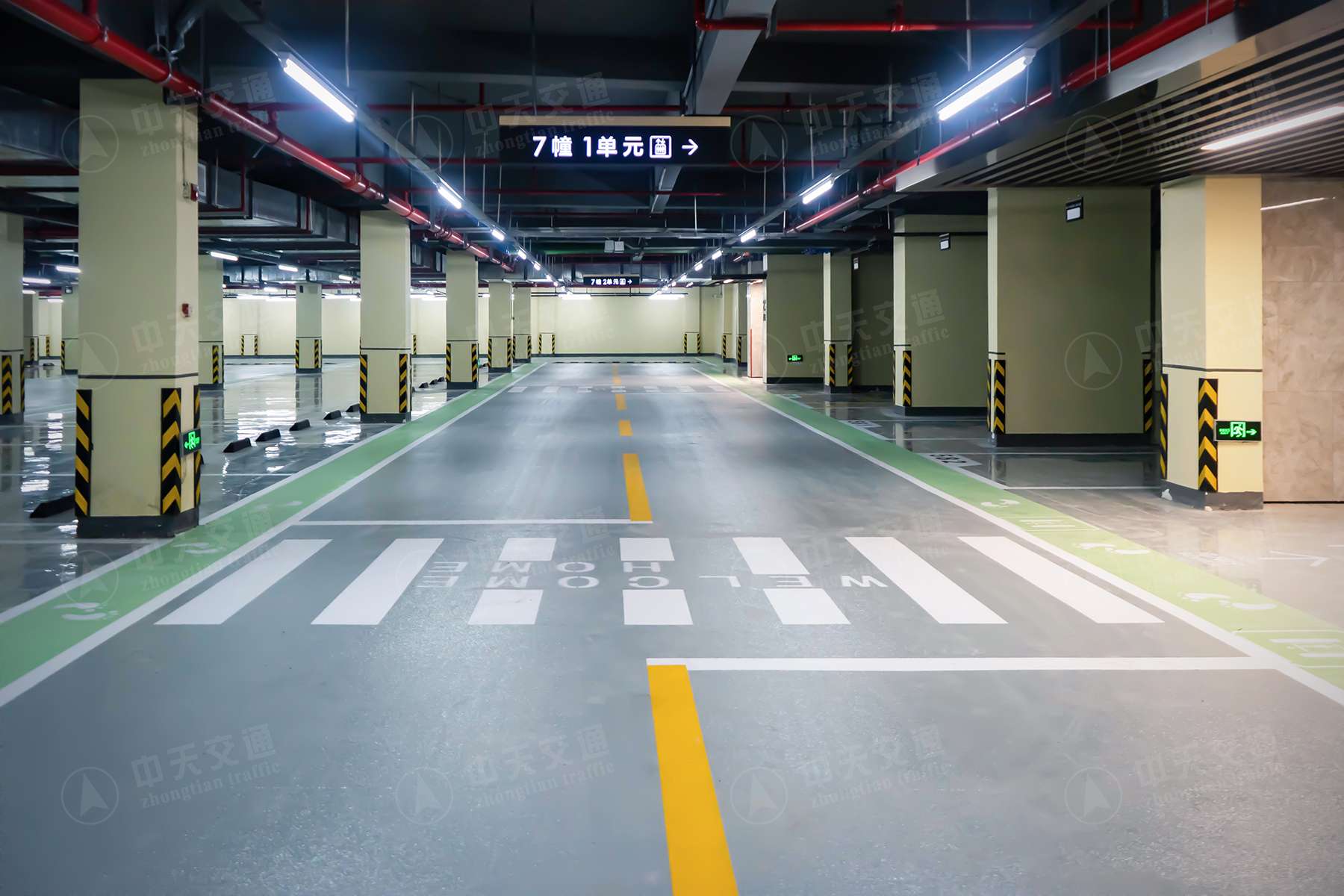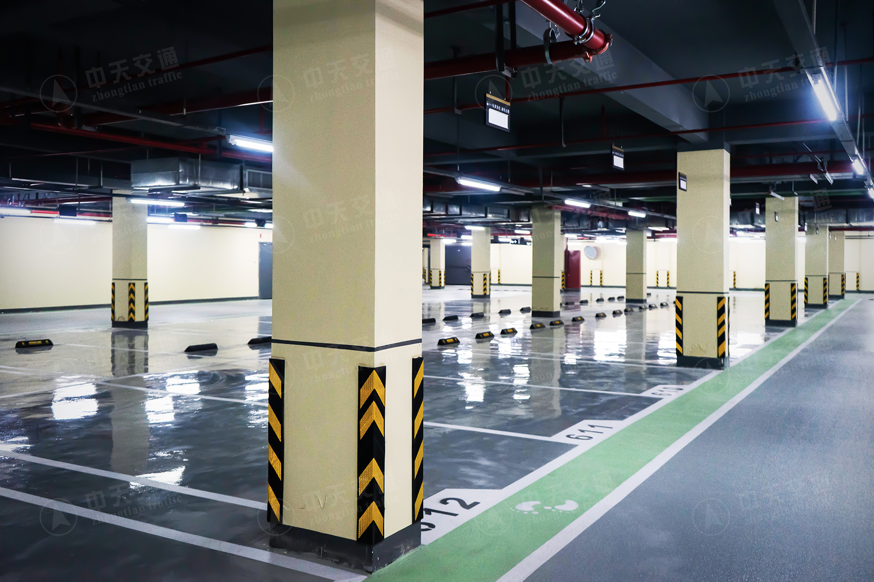 施工类型:车位:光面飞机灰;车道:橘纹飞机灰;坡道:环氧油性止滑坡道;人行通道:橘纹豆绿;楼梯间:中灰屋面:中灰丙烯酸