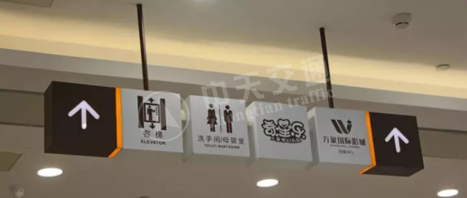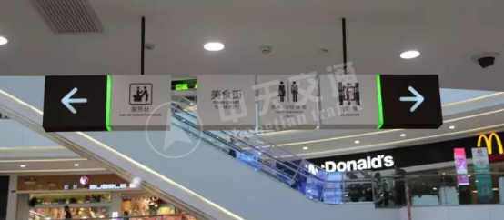 三级导视进入到商场、车库内部,指示功能区域或者工作区域等,我们可以看到大堂的索引牌、功能区的指示牌、电梯间的楼层指示牌等都采用了不同颜色的LED发光设计,这样的标识设计在兼顾时尚美观的同时保证了标识指引清晰明了具有连贯性,让顾客不需要询问就可以找到目的地。